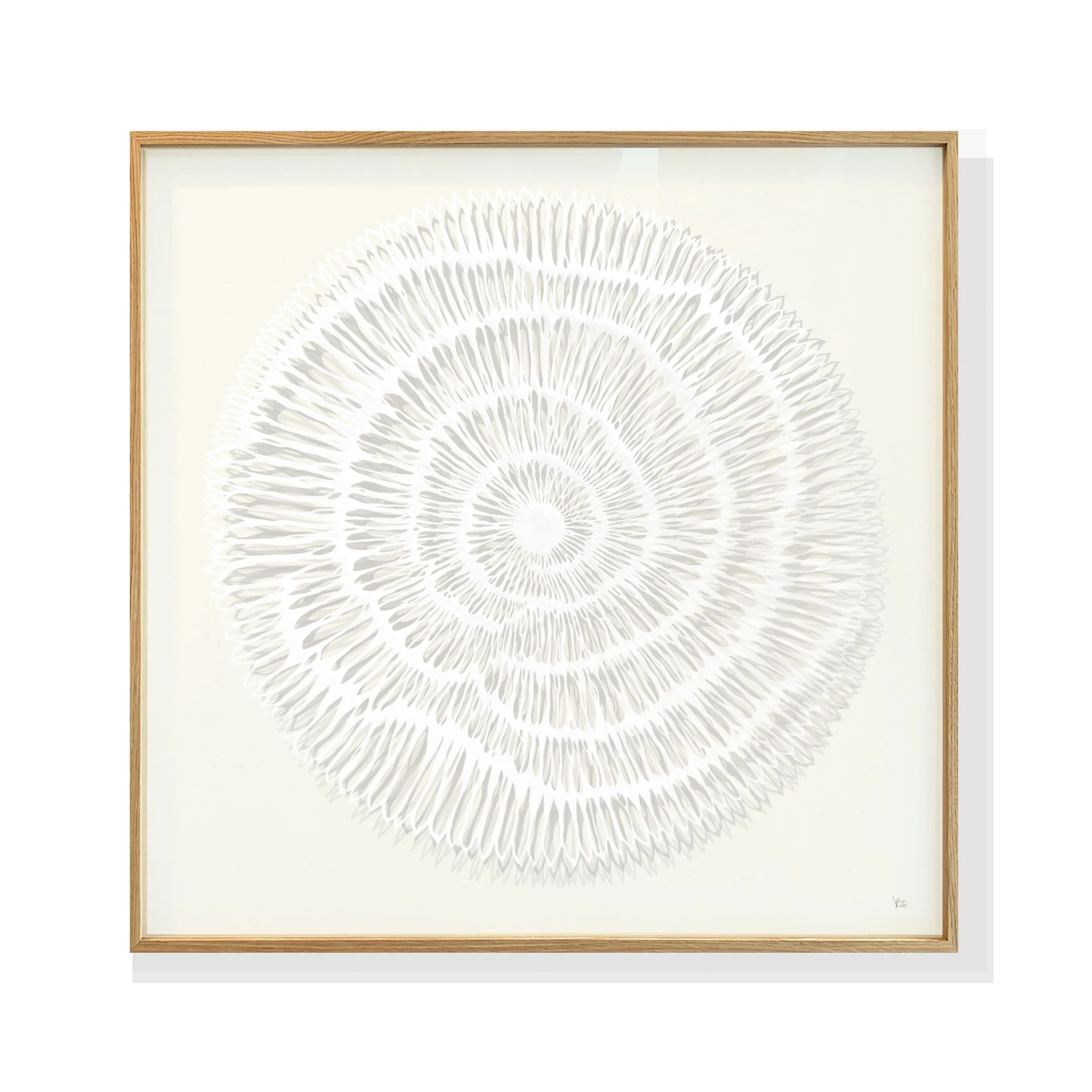 This piece is sold framed the price includes framing, floating between UV art glass in 1x1 meter handbuildt oak frame.